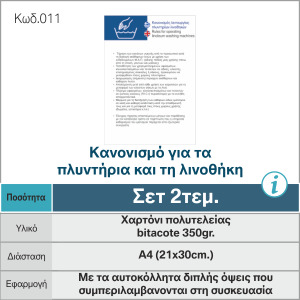 Αρχική » Shop » Πινακίδες Σήμανσης COVID-19 για Ξενοδοχεία & Εστίαση » Κανονισμός Για Τα Πλυντήρια Και Τη Λινοθήκη 2τεμ.